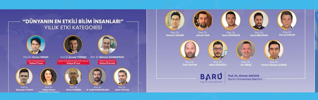 Bu yıl Türkiye'den yaklaşık 1800, Bartın Üniversitesi'nden toplam 18 akademisyenin yer aldığı “Dünyanın En Etkili Bilim İnsanları Listesi"ne bölümümüz öğretim üyesi Doç. Dr. Ümit Tayfun, “Yıllık Etki” kategorisinde giriş yaptı.Stanford Üniversitesi tarafından Hollanda merkezli bilimsel yayın şirketi Elsevier veri tabanında her yıl iki kategoride hazırlanan ve Science-Metrix sınıflandırmasına göre 22 bilim alanı ve 174 alt alanda sınıflandırıldığı “Dünyanın En Etkili Bilim İnsanları Listesi"'nde, BARÜ Temel Bilimler Bölümü öğretim üyesi Doç. Dr. Ümit Tayfun, 2024 yılı içindeki atıfları kapsayan “Yıllık Etki” kategorisinde Malzeme Bilimleri alanında Türkiye'de 71., Dünya sıralamasında 5834. sırada yer alarak listede yer buldu.